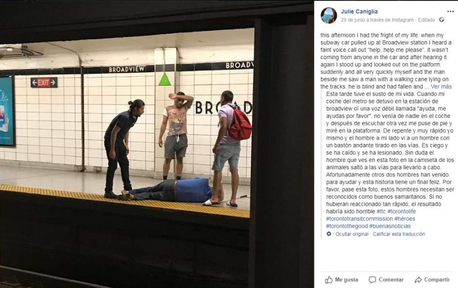Julie Caniglia, una usuaria de Facebook, presenció el pasado jueves 28 un hecho heroico protagonizado por tres personas anónimas en el metro de Toronto y ha lanzado desde sus redes una petición para lograr identificar a estos tres «buenos samaritanos» para que tengan su reconocimiento.